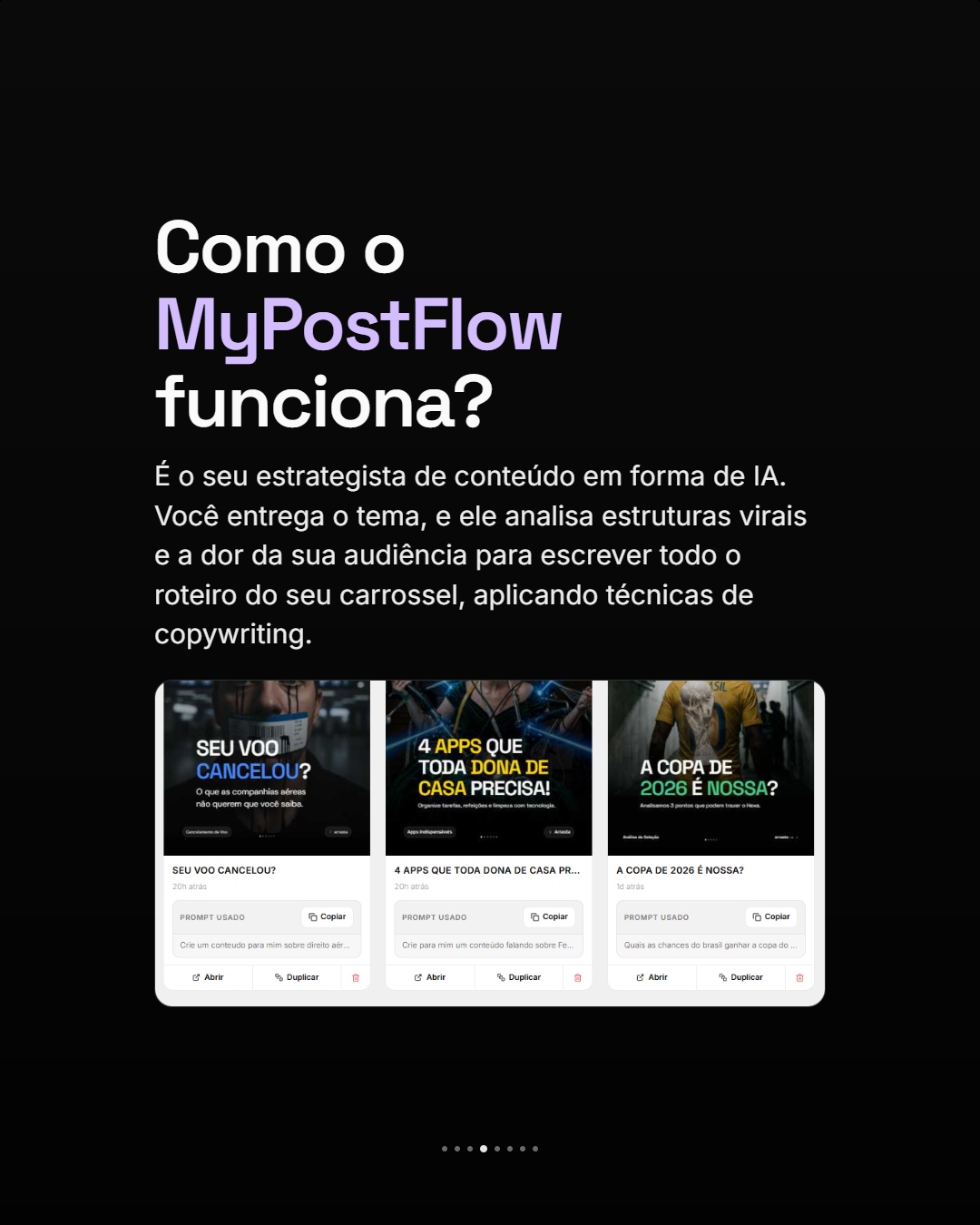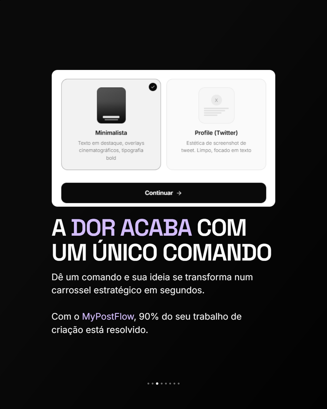 Em segundos, a IA gera texto persuasivo, escolhe o layout perfeito e monta o carrossel completo.